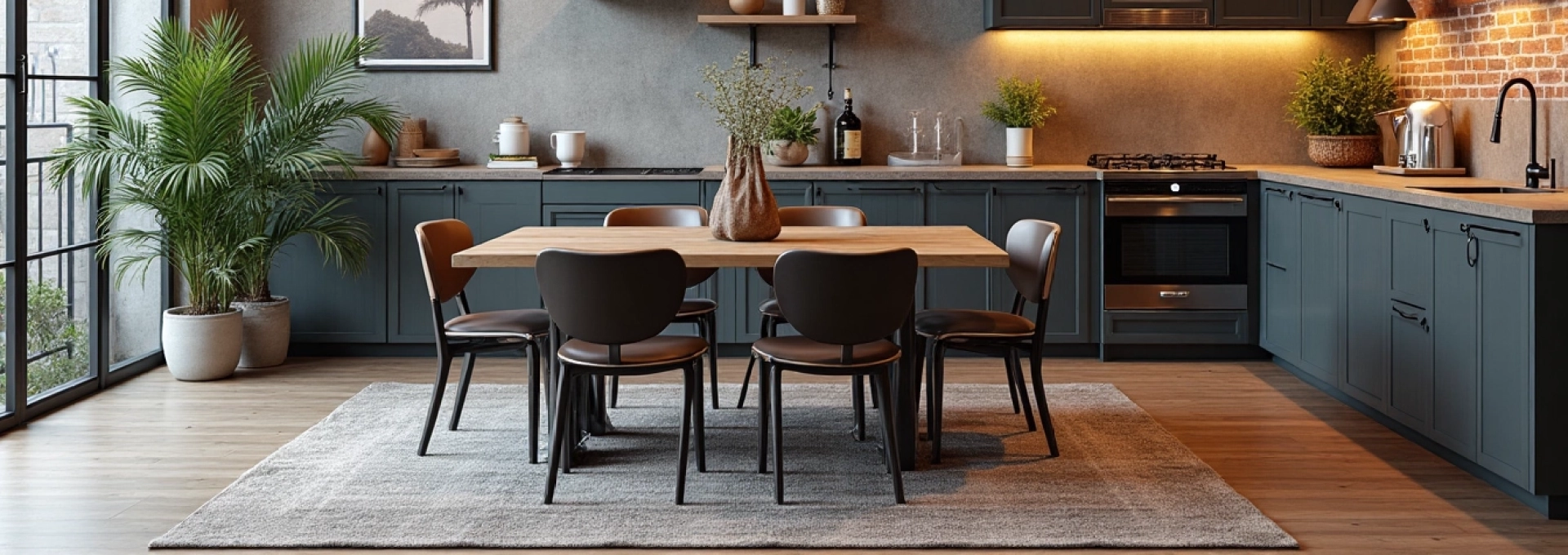 Dans un grand espace type loft, on peut pleinement exploiter les codes du style industriel. Les hauts plafonds permettent d’installer des suspensions imposantes, tandis que les grandes surfaces au sol offrent la possibilité de créer des zones distinctes sans cloisonnement. Un îlot de cuisine central peut servir de point de séparation entre l’espace cuisine et le salon, tout en maintenant la fluidité caractéristique du style.